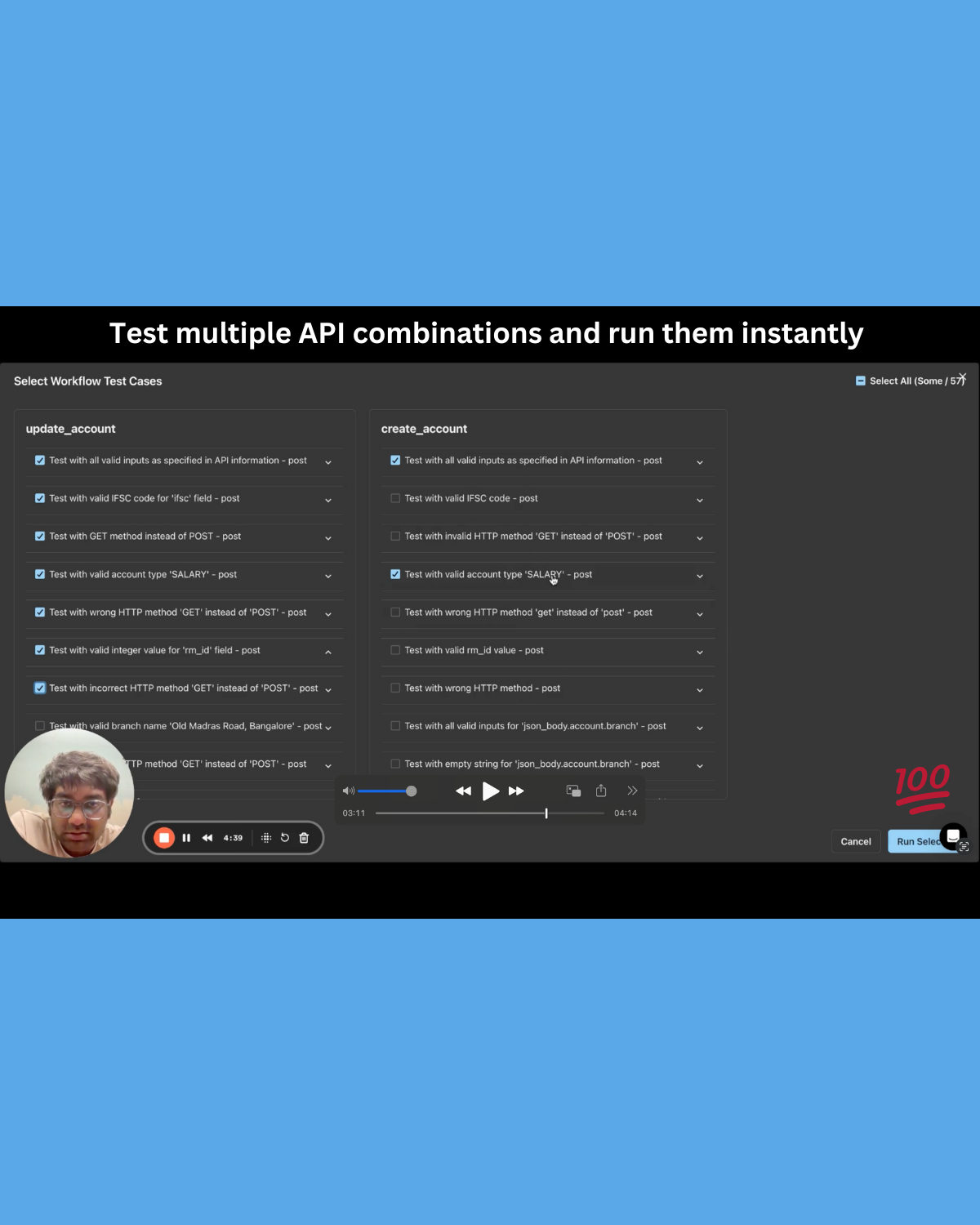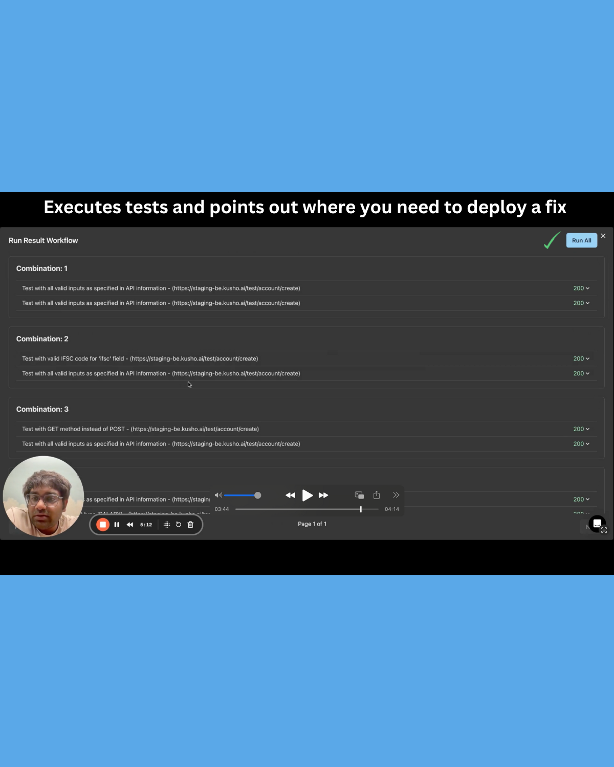 You can test out multiple API combinations and run them instantly. KushoAI will execute all the tests instantly for you.