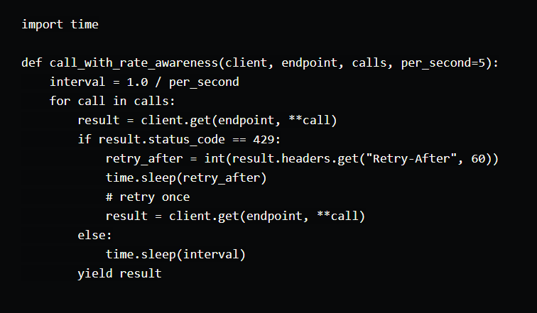 A naive test might loop through 50 API calls sequentially. An intelligent test accounts for the available quota before each call. This is an example of adaptive pacing that respects API rate limits during live test runs: