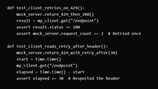 Retry logic creates silent failures. If your client auto-retries on 429, your tests might pass despite bad behavior hiding underneath.