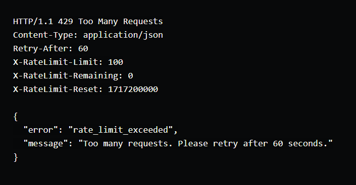 What a good mock should simulate, the below example shows the full response structure your mock server should return to replicate realistic API throttling behavior: